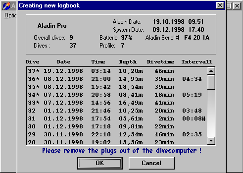 all dives stored in the Aladin (max 37). Dives will be numberd from 1