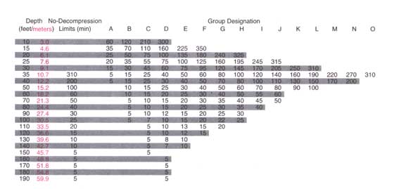 US Navy No-Decompression Limtis and Repetitive Group Designation Table 0 - 300 m